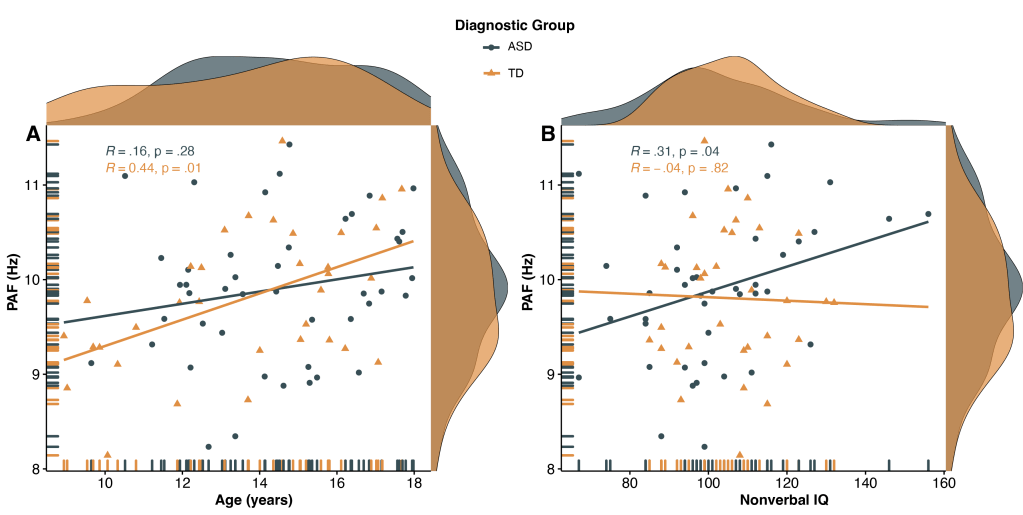 Peak alpha frequency, a marker of neural maturation, is more related to age in neurotypical children and cognitive ability in autistic children