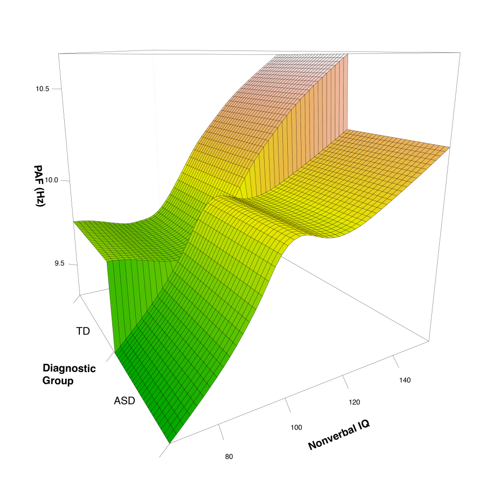 Contour plot depicting different relationships between cognitive ability, age, and peak alpha frequency in autistic and neurotypical youth